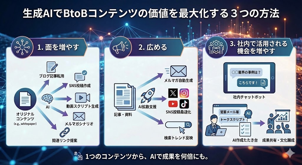 以上、生成AIを活用してコンテンツの価値を最大限引き出す方法を紹介しました。 「面を増やす」「広める」「社内で活用される機会を増やす」。この3つの視点を持つことで、1つのコンテンツから得られる成果は何倍にも膨らみます。 この記事ではすぐに試せる方法ばかりを紹介しましたので、実行してぜひコンテンツから成果を引き出してください。他にも良い方法があれば、ぜひXなどで教えてください。
