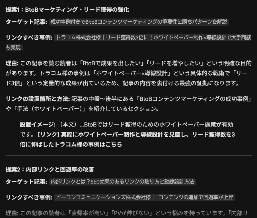 次に、以下のようなプロンプトを投げて、どの記事でどの事例を紹介すると良いかを提案してもらいます。