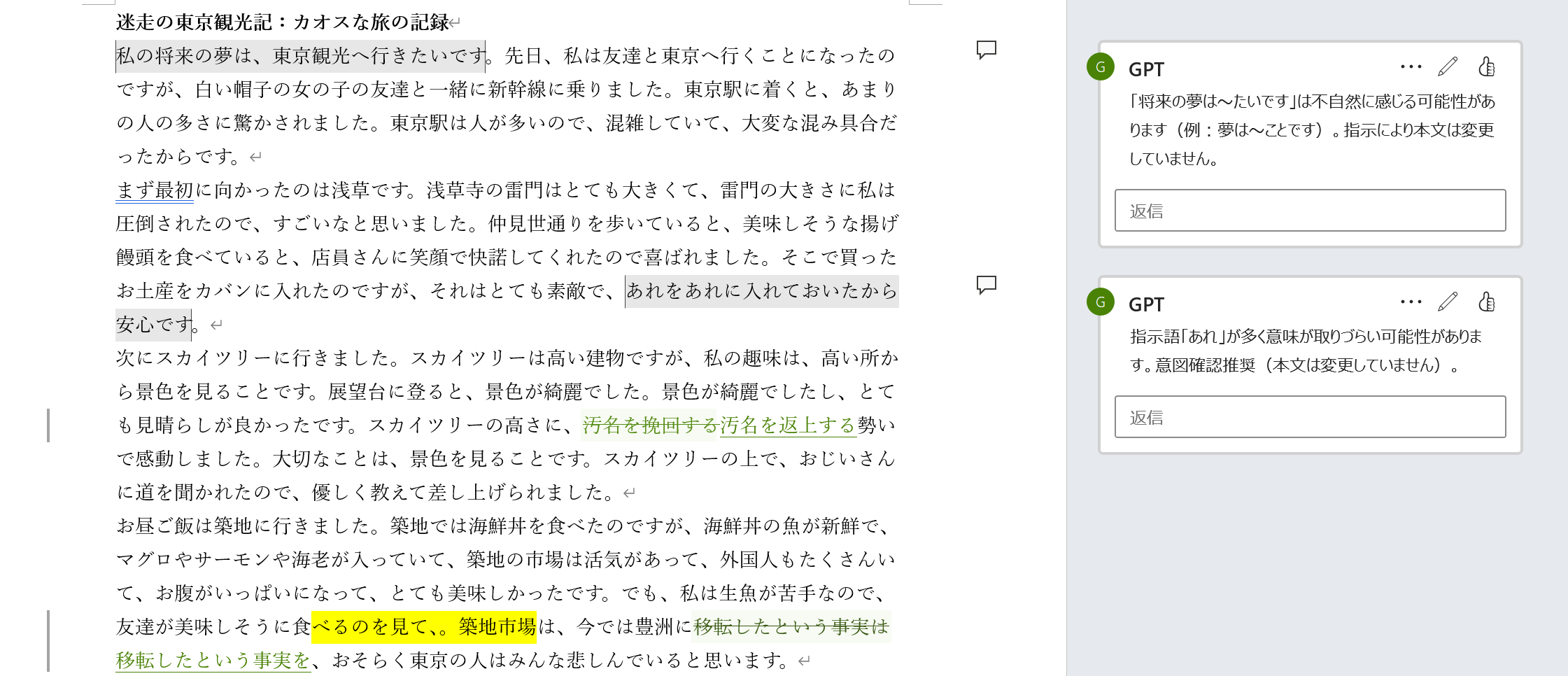 OpenAI提供のChatGPTに対して「Wordファイルに修正履歴を残して校正してください」と指示すると、実行を試みてはくれます。実は文章校正の精度は悪くありません。チャットベースで修正文章を出力させると、よい文章を提案してくれます。