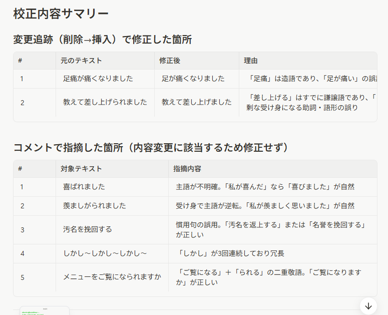 - 校正レポートとして出力:採用した修正提案と、採用しなかった意見(「その他の意見」として記載)をまとめたレポートを生成