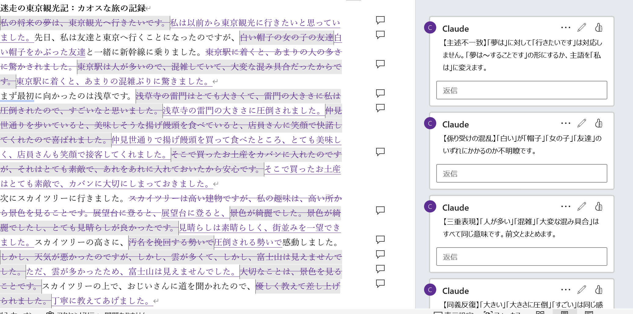 - 主語の行方不明: 文が長すぎて、途中で誰の話をしているのか分からなくなる。