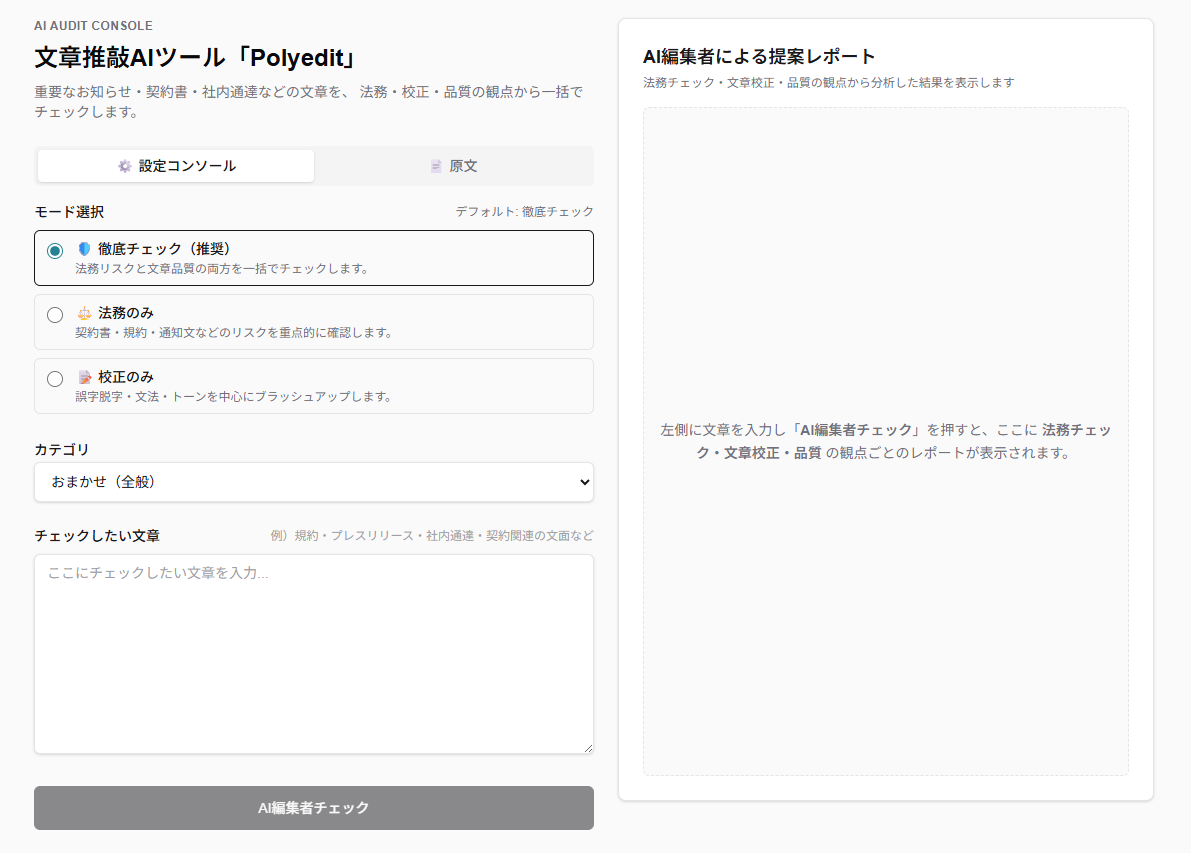 - 最終的に人間が確認:校正レポートの中身を担当者が確認し、最終判断を行う