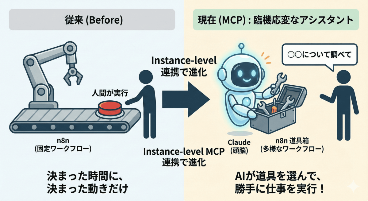 これまで、業務自動化ツール「n8n」は、決まった時間に決まった動きをする「工場のラインロボット」のような存在でした。しかし、今回の連携によって、n8nは「Claudeの道具箱」へと進化しました。