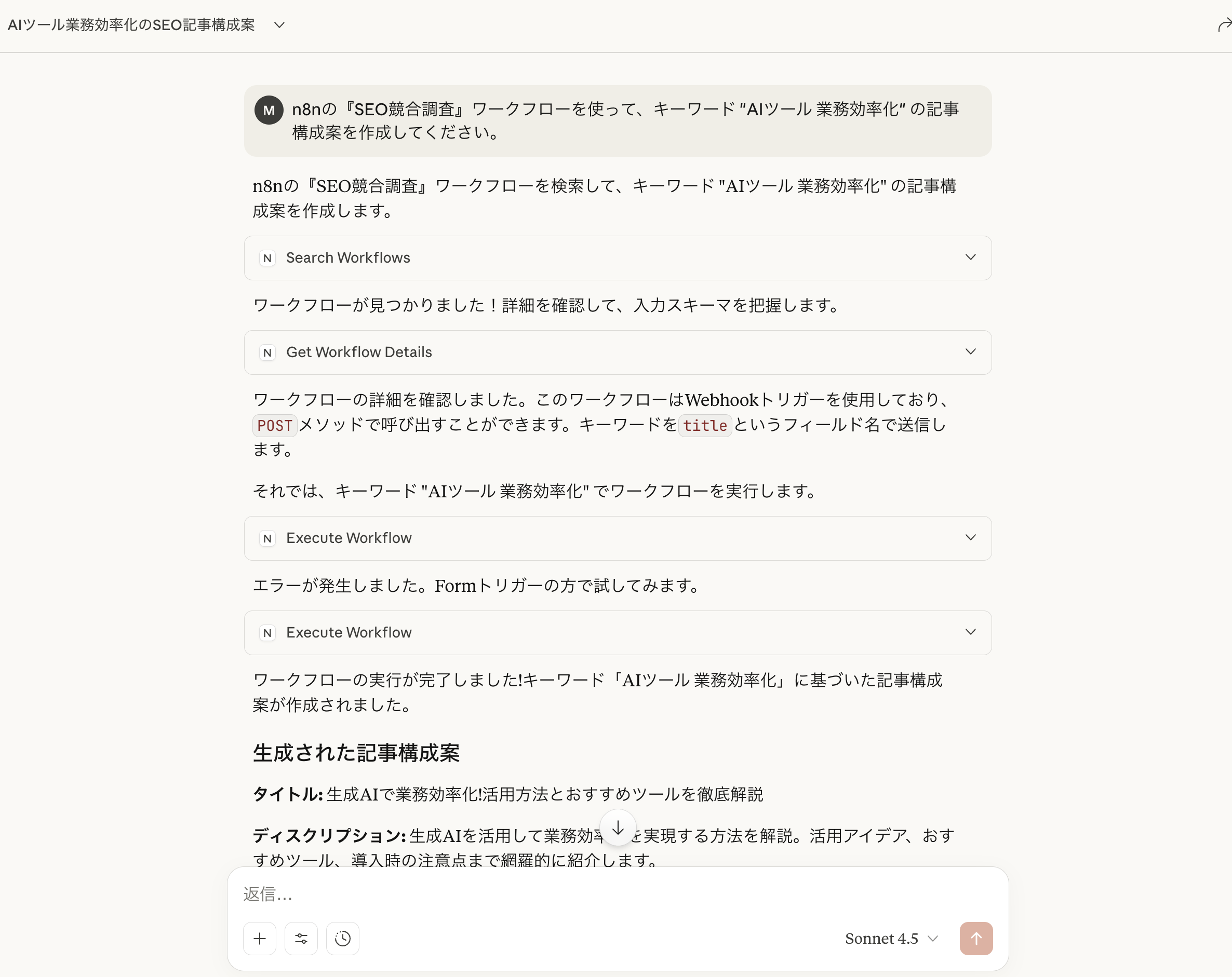Claude: ワークフローの実行が完了しました!キーワード「AIツール 業務効率化」に基づいた記事構成案が作成されました。