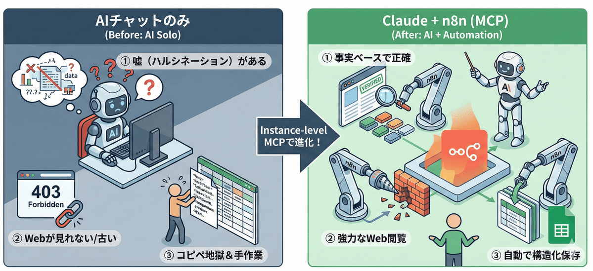 確かに「単発の検索」ならAI単体でも可能です。しかし、「業務として回す」ことを考えた場合、n8nを組み合わせることに決定的なメリットがあります。