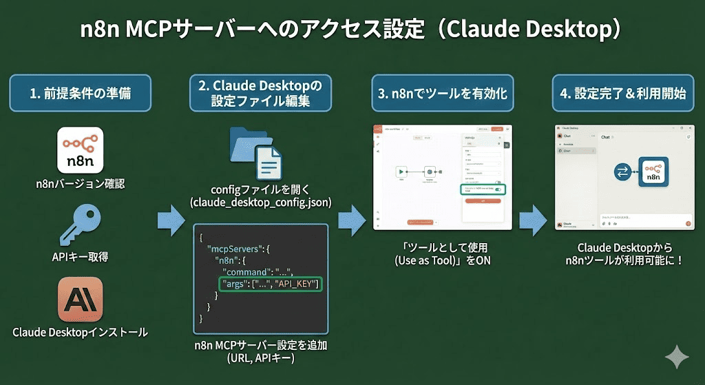 n8nを「手足」として使うことで、Claudeはこうした複雑な社内フローの「司令塔」になることができます。