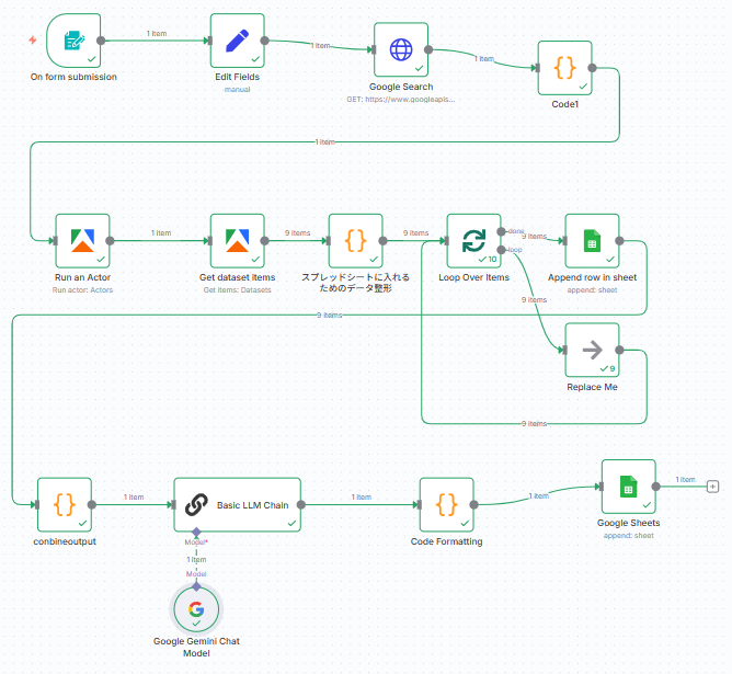 以下はn8nというツールを使って、記事を書くための簡易的な下調べをするワークフローです。Google公式のAPIを使ってGoogleの検索結果を取得し、上位サイトにどのようなことが書いてあるかを取得し、それらをまとめてスプレッドシートに書き、さらに記載した内容の一部をプロンプトをGeminiに投げて、アウトプットをまたスプレッドシートに書くという一連の流れが自動化されています。