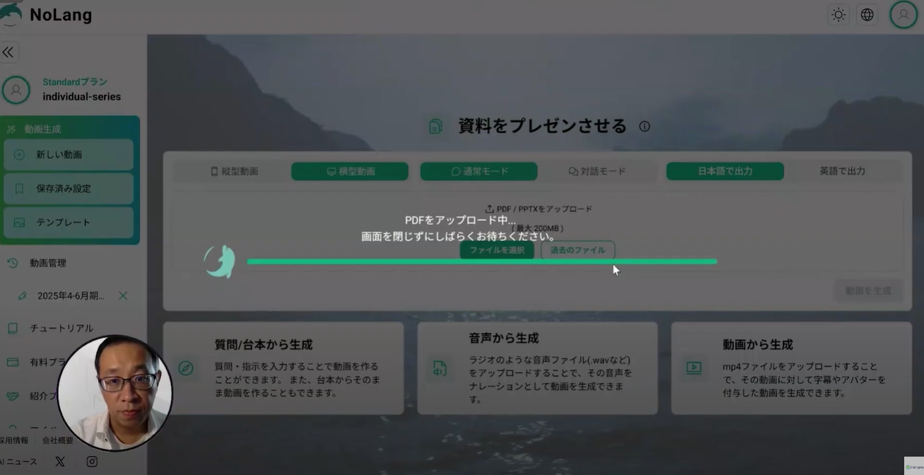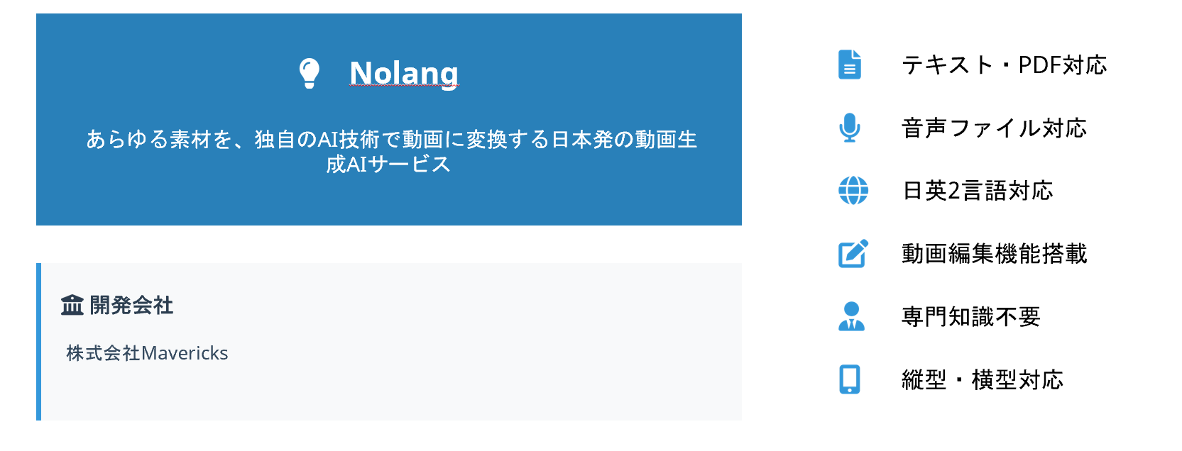 Nolangは、株式会社Mavericksが開発した日本発のAIサービスです。その核心的な機能は、PDFなどの資料をアップロードするだけで、AIアバターが内容を解説する動画を自動で生成するというもの。