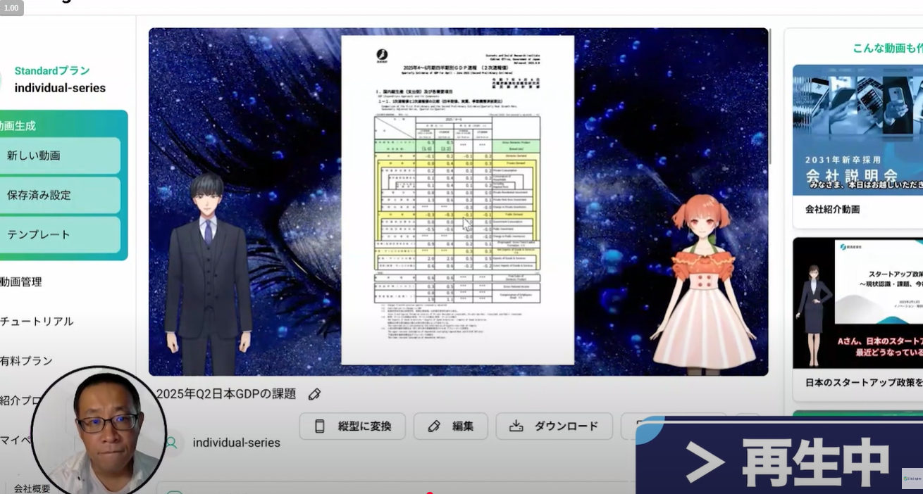 Nolangの「対話モード」を使えば、2人が対話形式で説明をする動画を作成することも可能です。紹介のYoutube動画では、内閣府が発表したGDP速報という、専門的で複雑な資料を解説する様子をもいることができます。