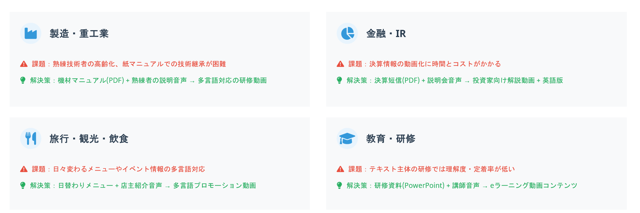•専門スキルの不要化: 誰でもプロ品質の解説動画を作成できる。
