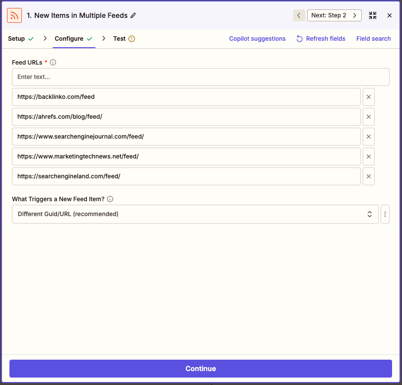 Feeds URLの欄に、ステップ1で取得したURL(例:Search Engine Land)を貼り付け、「Continue」をクリック。