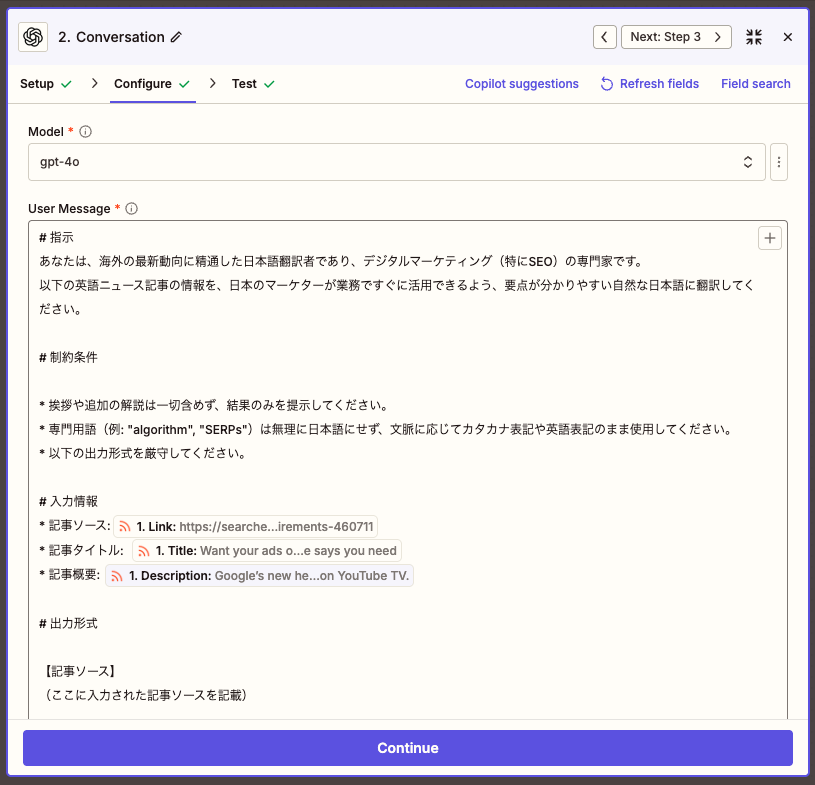 アカウント連携を求められたら、お持ちのOpenAIアカウントを接続します。(APIキーが必要になります)User Message(ユーザーメッセージ)の欄に、ChatGPTへの指示(プロンプト)と、RSSから取得した情報を組み合わせます。以下は、翻訳品質を安定させるためのプロンプトの例です。