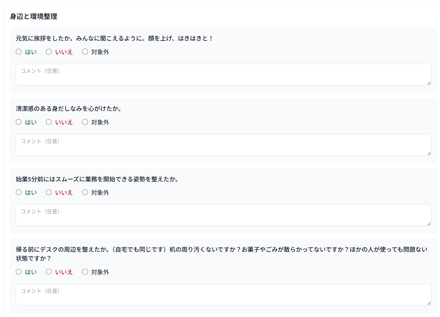 スタッフは、始業前と業務終了後のわずかな時間を使って、前日、もしくはその日の自分の行動を振り返ります。これらをポチポチとチェックします。