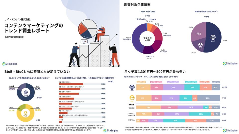 調査の結果から、BtoB・BtoCの傾向の違い、利用するチャネル、月々の予算、2023年注力予定の施策、コンテンツ制作の課題などが明らかになりました。また、本記事では今回の調査結果をもとにしたBtoB企業様に適切なコンテンツマーケティング手法を公開しています。
