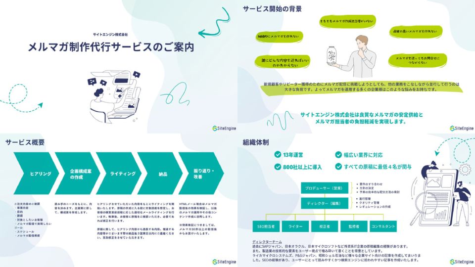 サイトエンジンはメルマガ制作を代行しております。メルマガの安定共有と担当者様の負担軽減のためにご活用ください。