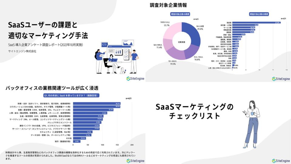 調査の結果から、SaaSの用途や認知のきっかけ、情報収集手段、導入前の検討期間、導入の決め手、導入後の課題などが明らかになりました。また、本資料では今回の調査結果をもとにしたSaaS運営企業様に適切なマーケティング手法などを公開しています。