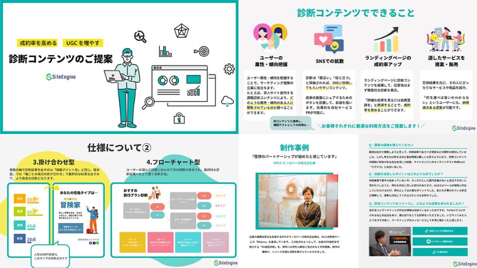 診断コンテンツとは、ユーザーにいくつかの質問に回答してもらい、回答にあった結果を表示させるコンテンツです。診断結果を出力することで、興味を持ってもらい情報の拡散や購入・資料請求・お問い合わせなどにつなげます。