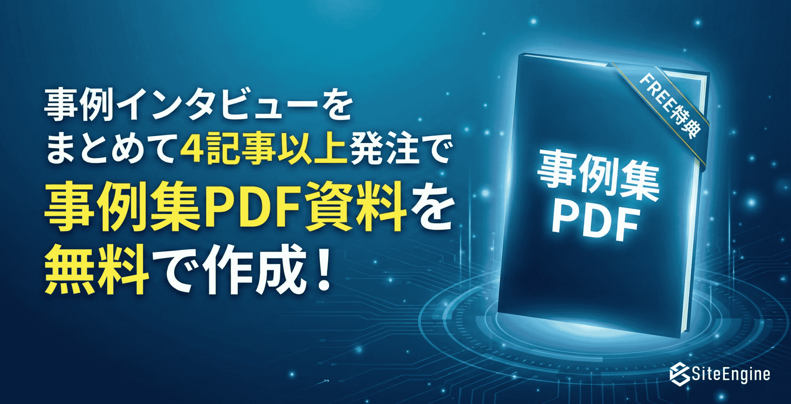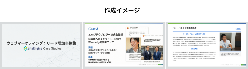 サイトエンジンでは、こうした課題を解決するため、事例インタビュー記事をまとめて4記事以上ご発注いただいたお客様に、それらをまとめた「事例集PDF(ホワイトペーパー)」を無料で作成する新キャンペーンを開始いたします。