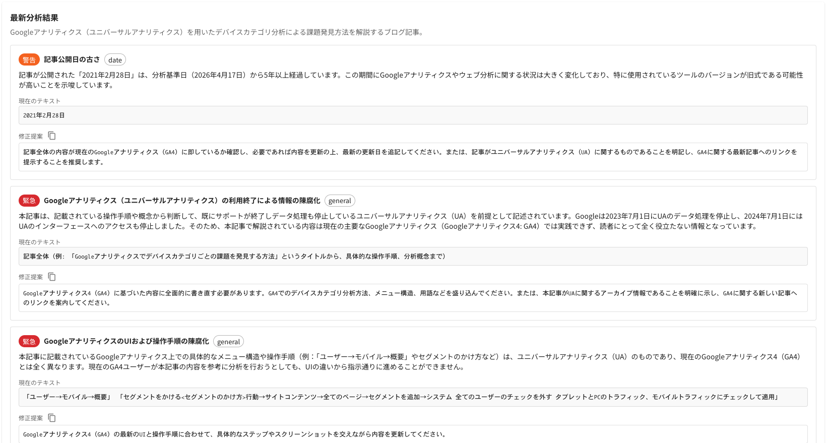・陳腐化検知: 最新の法律、統計データ、社会情勢等と照らし合わせ、修正が必要な可能性が高いページを特定します。