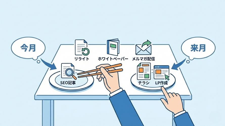 「今月は集客を強化したいからSEO記事」「来月は展示会があるからチラシとLP作成」など、貴社の状況に合わせてメニューを自由に組み合わせられます。 SEO、リライト、LP制作、ホワイトペーパー、メルマガ配信など、BtoBやリード獲得に必要な施策を網羅しています。