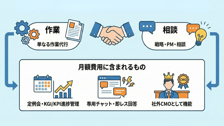 単なる作業代行ではありません。月額費用には「戦略設計・PM費」が含まれています。 毎月の定例会でのKGI/KPI進捗管理はもちろん、専用のチャットルームを開設し、Webマーケティングに関する日常的な疑問・相談にも即レスで回答。社外のCMO(マーケティング責任者)として機能します。