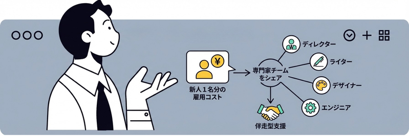 新人スタッフ1名分の雇用コストで、ディレクター・ライター・デザイナー・エンジニアなどの「専門家チーム」をシェアできる伴走型支援パッケージです。